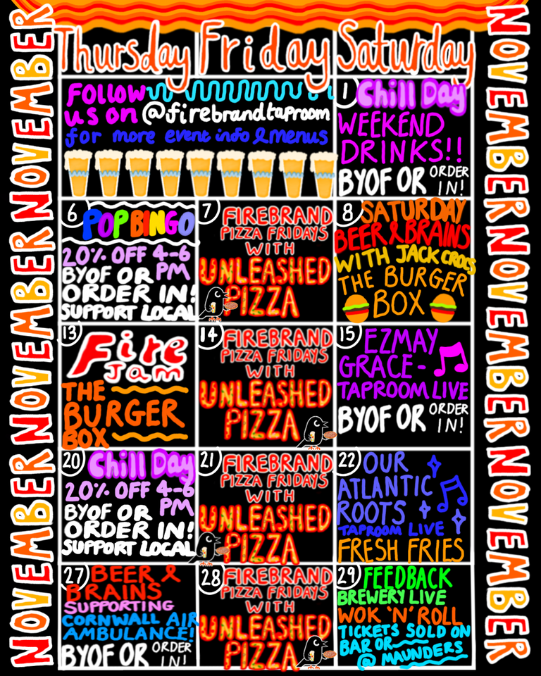 Join us on Saturday 8th November and Thursday 27th November for our Beer & Brains Quizzes. £2 entry per person- the Saturday quiz is winner takes all- on the Thursday quiz the winning team takes home half the cash, the rest will be donated to Cornwall Air Ambulance this month! Check our socials for the food vans on these dates!